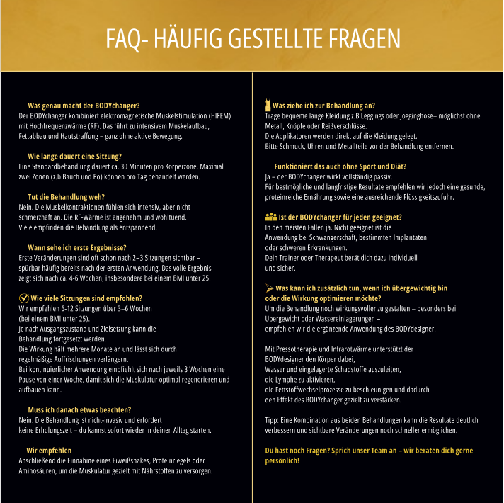 Wenn du dich krank fühlst, solltest du den BODYformer nicht verwenden. Auch wenn du schwanger bist oder die Kupferspirale hast, ist eine Trainingssession nicht möglich. Metallische Gegenstände sollten sich nicht im Anwendungsbereich am und im Körper befinden, bspw. ein Herzschrittmacher. Bitte sprich vorher mit deinem Arzt.